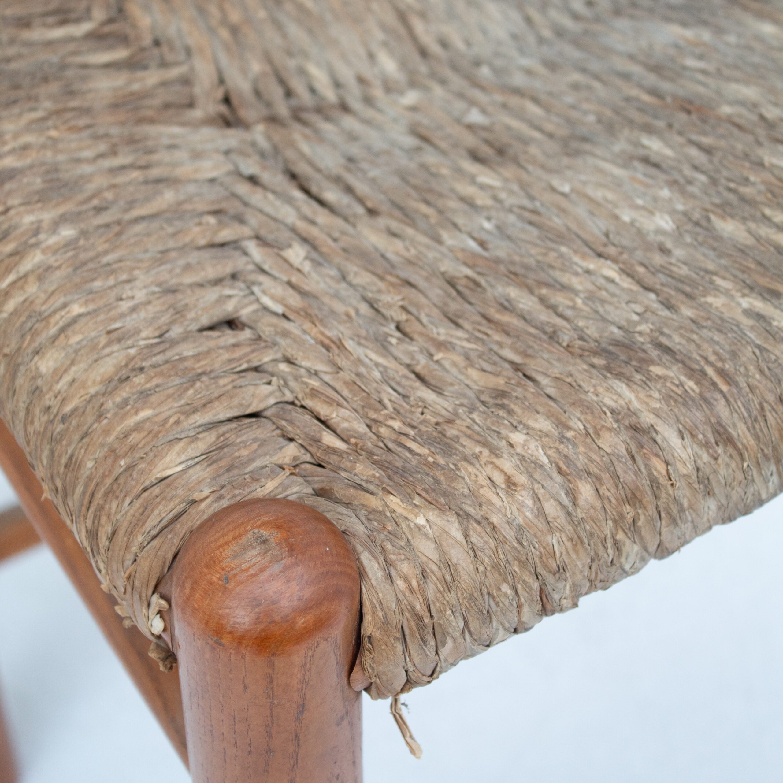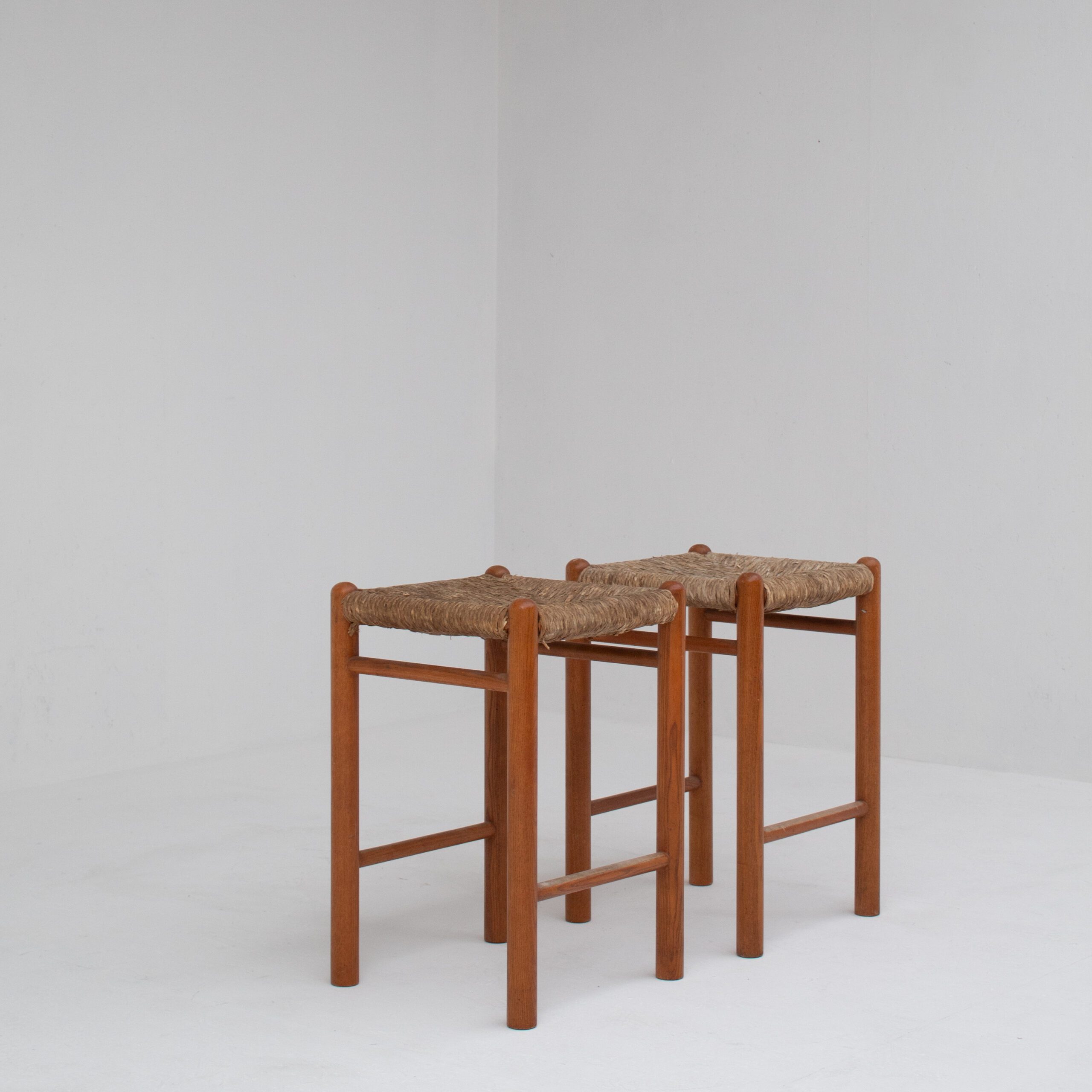 This pair of wooden stools with rush seats combines rustic craftsmanship with timeless simplicity. The square wooden frames, with their rounded details, support woven rush seats that bring warmth and texture. The stools reflect a traditional approach to design, where natural materials and straightforward construction meet.