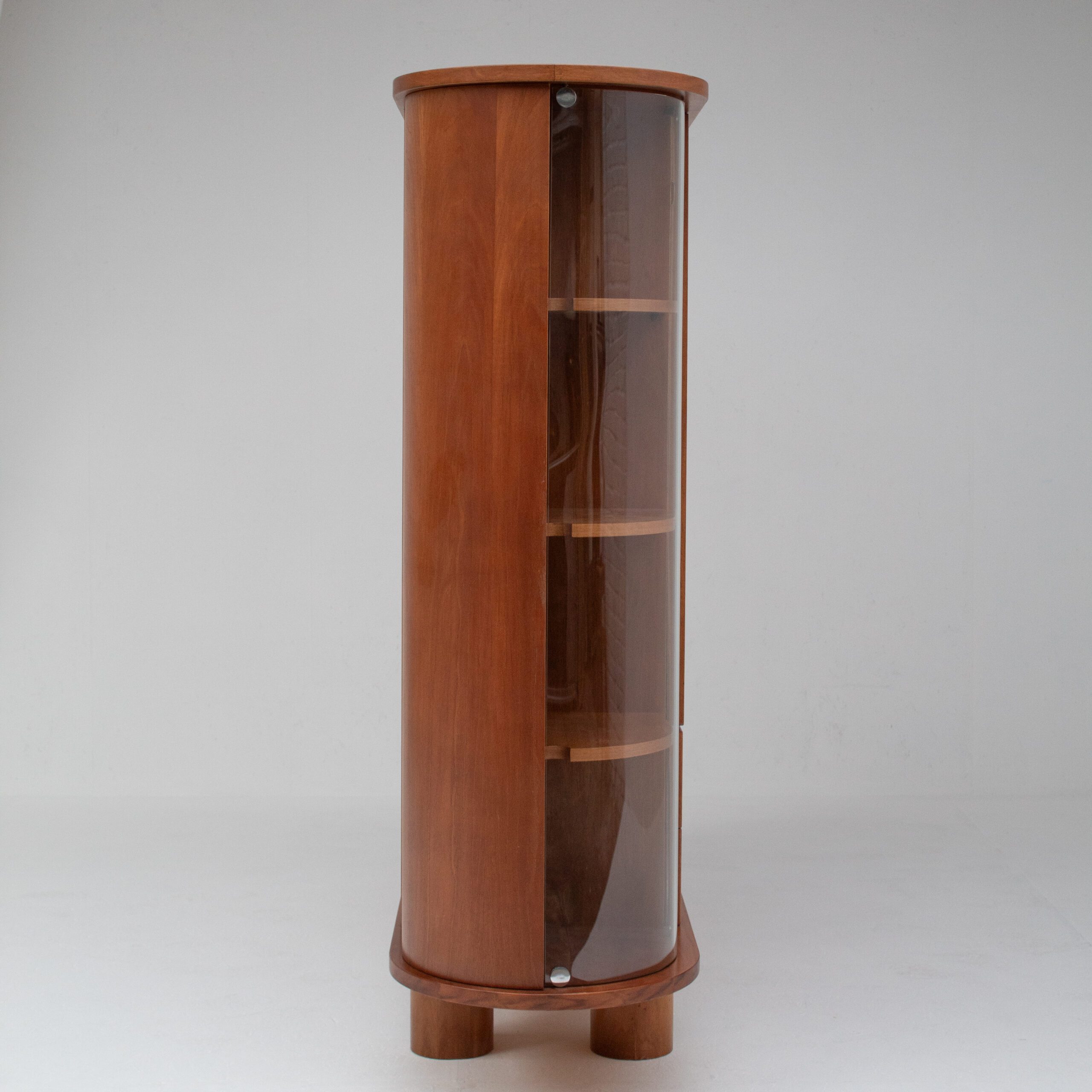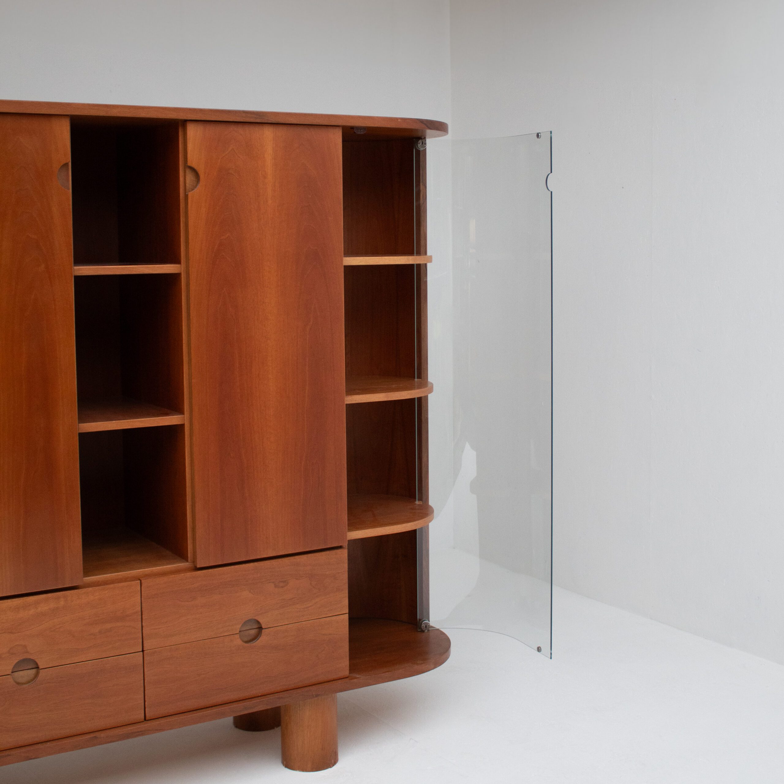 The Architectural High Cabinet captures the spirit of 1970s design with bold lines and refined details. Its form combines strength with elegance, making it a true statement piece. The cabinet features a solid wooden frame with rounded corners and cylindrical legs that lift the structure from the ground, giving it a sculptural presence.