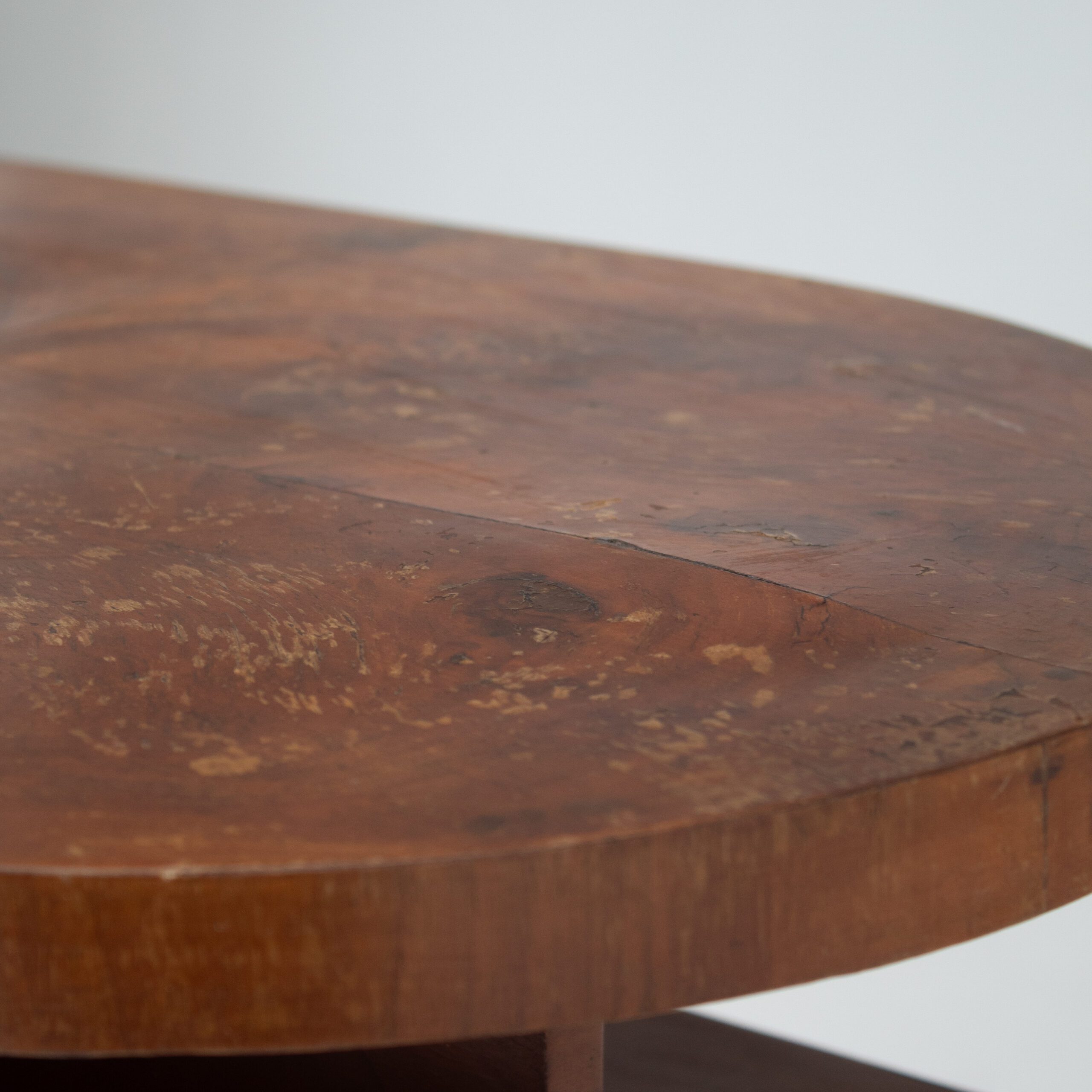 This Art Deco etagere is defined by its sculptural silhouette and warm walnut veneer. The composition balances curved platforms with solid geometric volumes, creating a piece that feels architectural yet refined.