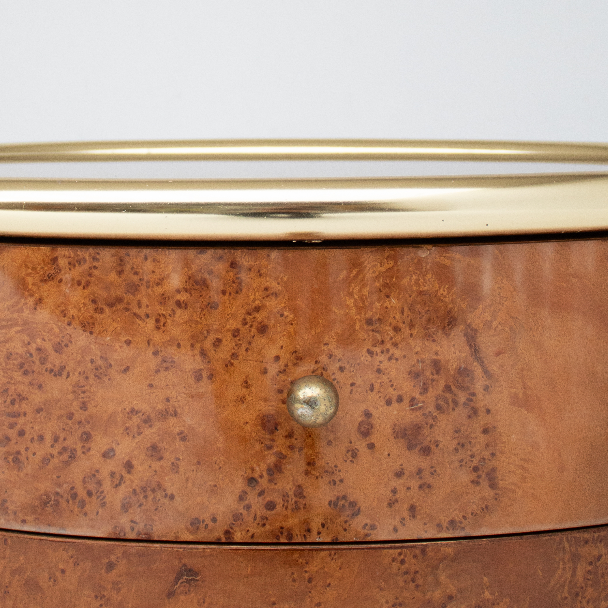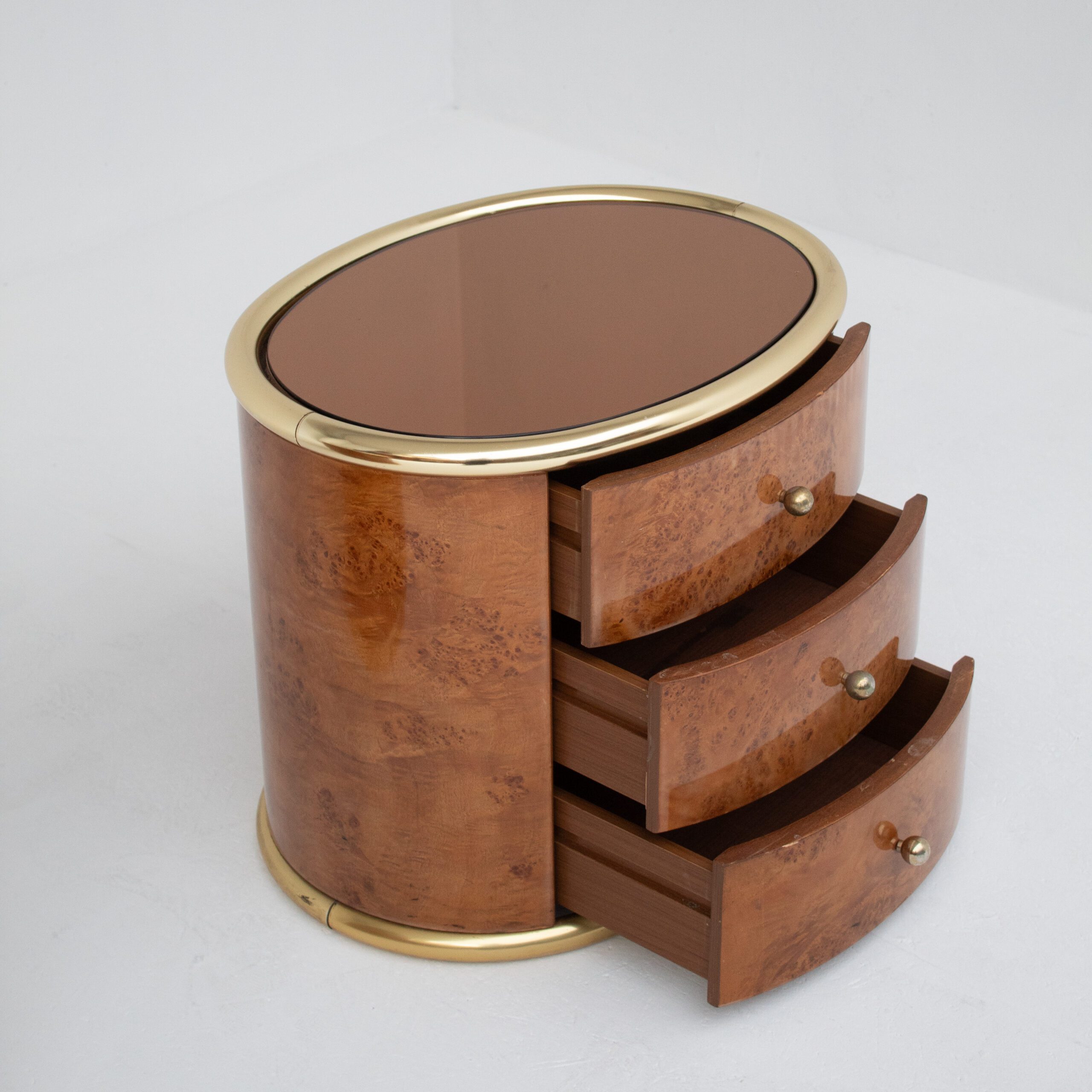 Imagine them next to a low vintage bed, with a reading lamp casting light across the burl wood surface. The polished brass edge reflects a subtle glow, while the drawers keep essentials close at hand without disturbing the calm of the room.