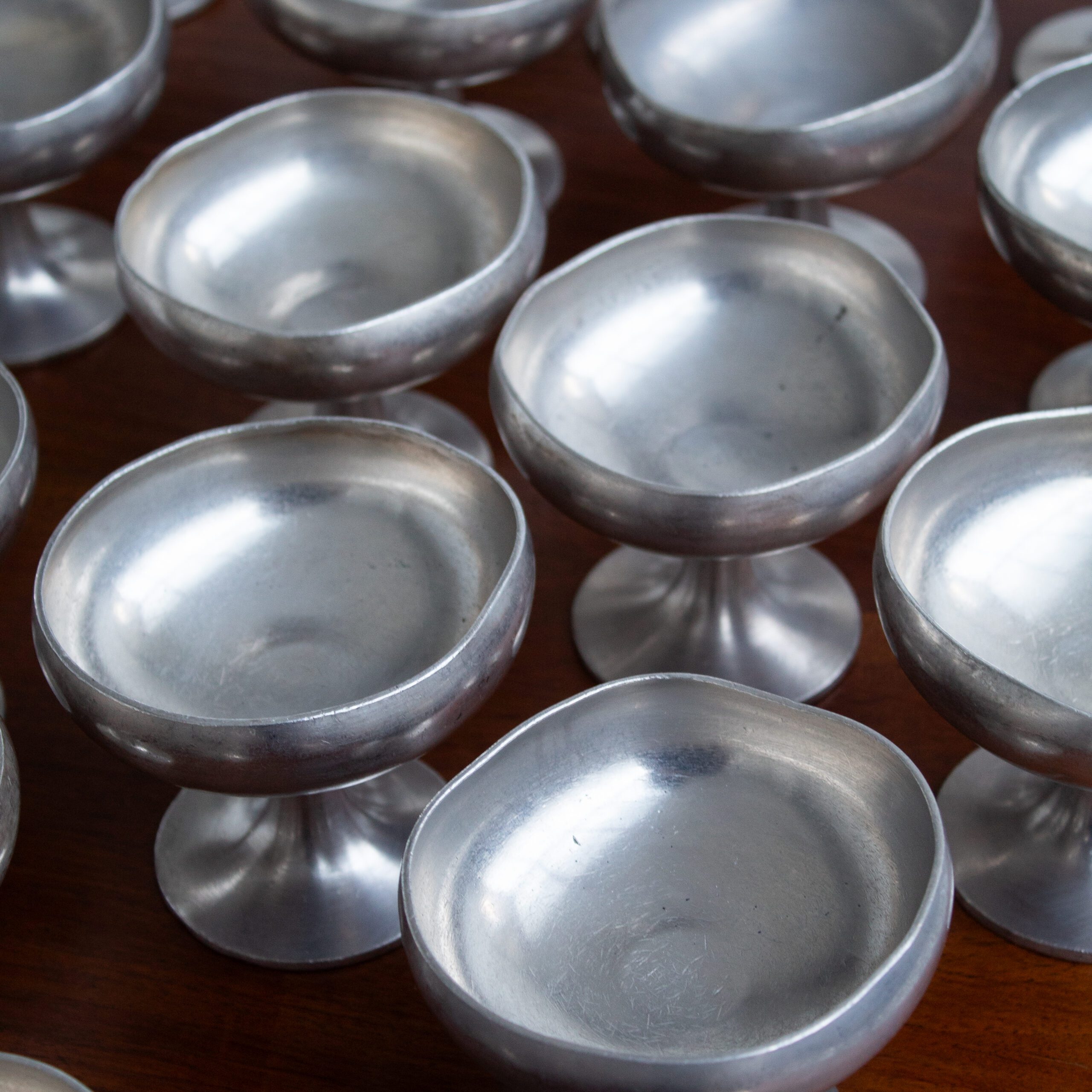 The soft curves and restrained proportions make these Gio Ponti ice cups ideal for serving ice cream, fruit, or desserts. They also work beautifully as decorative table objects. The silver-plated finish adds a subtle sheen and develops character over time.