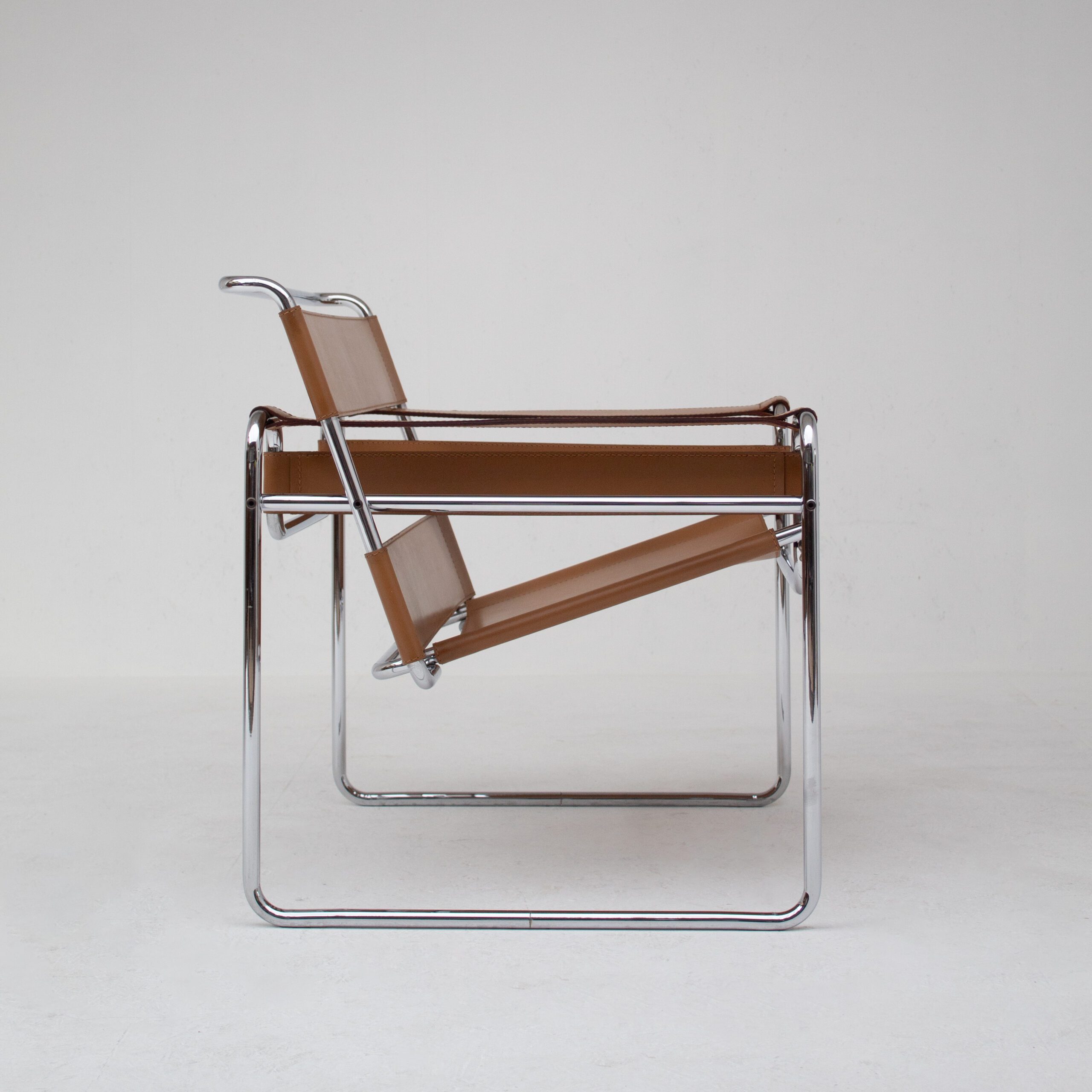 This Marcel Breuer Wassily Chair in cognac leather captures the spirit of modern design. This chair combines Bauhaus structure with soft, natural tones. The chrome frame adds a light and open look, while the leather brings warmth and texture.