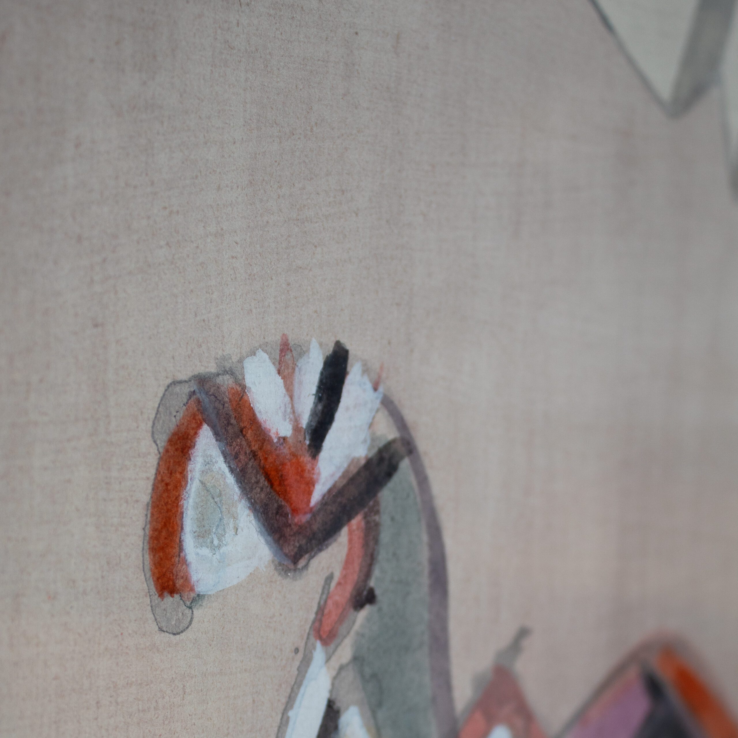 The work is signed and dated “77”. The composition explores the tension between structure and movement. Graphic elements interact with more fluid shapes, creating a dynamic visual balance. The textured paper adds warmth and subtle tactility.