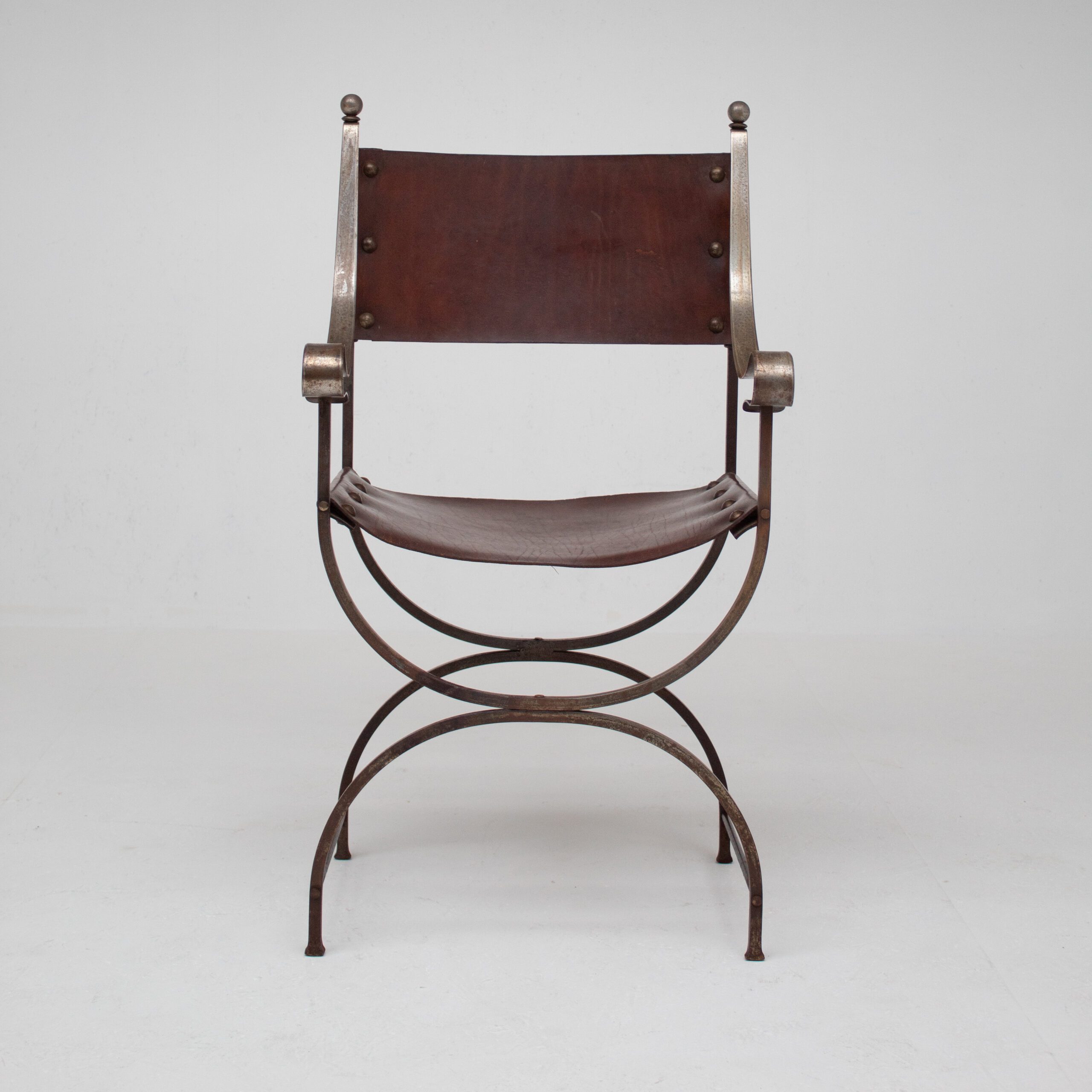 The metal structure creates a light and well-balanced silhouette. Curved armrests and small spherical finials add a subtle decorative detail, characteristic of mid-century French design. The leather has developed a rich, natural patina over time, enhancing the individuality and character of each chair.