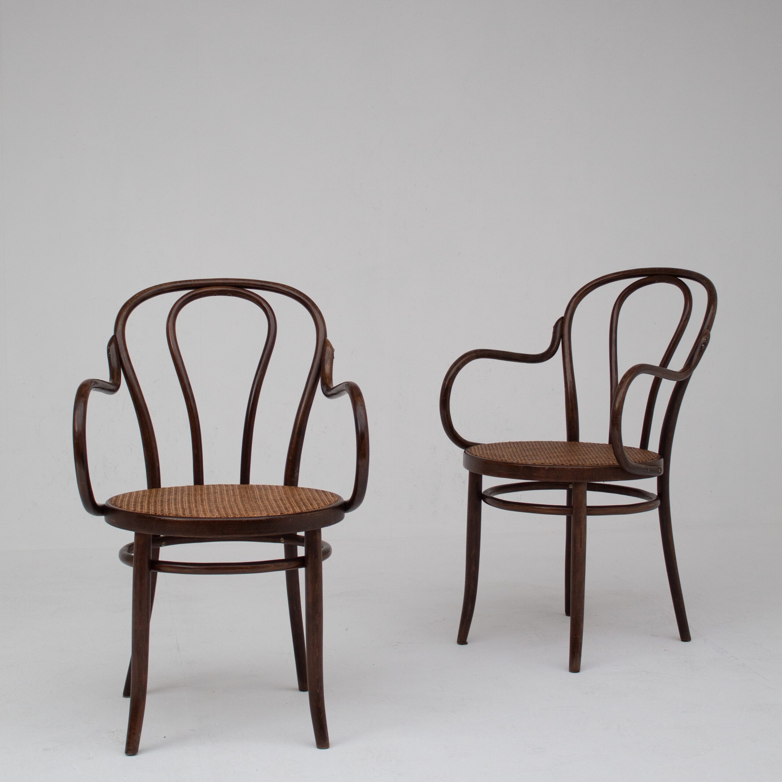 This pair of Thonet armchairs shows the elegance of classic bentwood design. The curved frames and cane seats create a light yet strong look. Their dark wood finish adds warmth and depth, while the sculpted armrests give comfort and style.