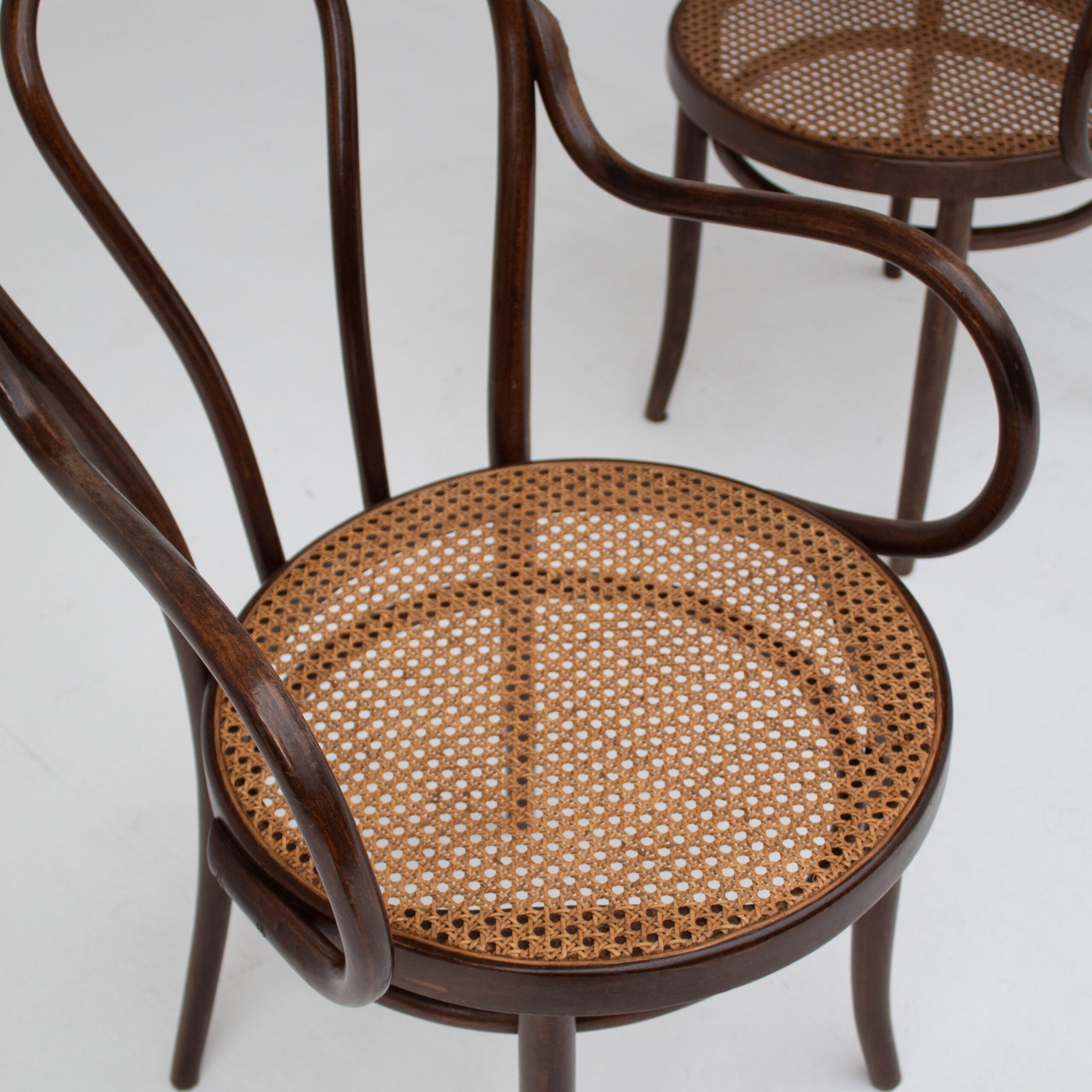 These Thonet armchairs are versatile pieces. Use them around a dining table, as statement chairs in a living room, or in a creative workspace. Their organic curves bring movement to any space, while the cane seats keep the design airy and timeless.