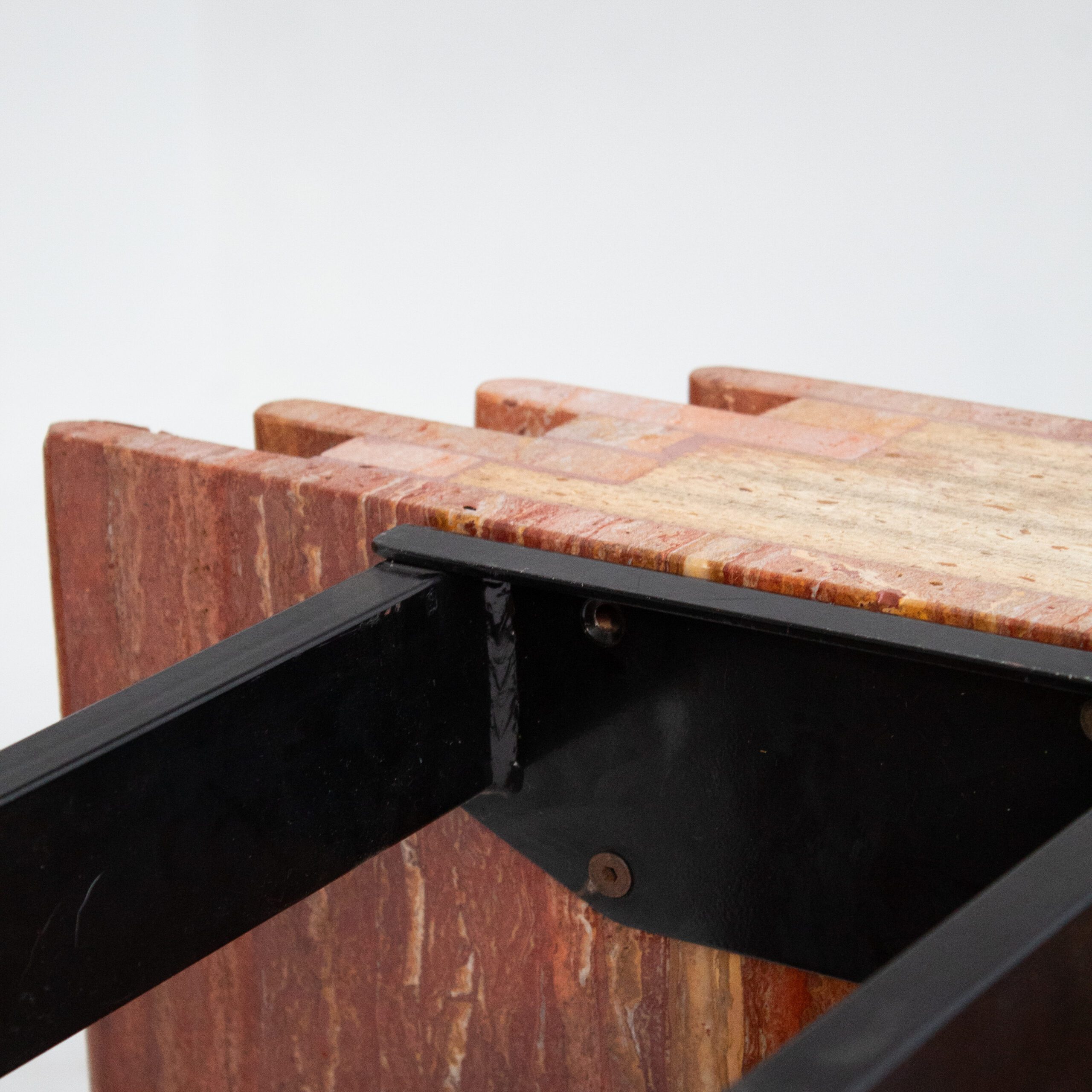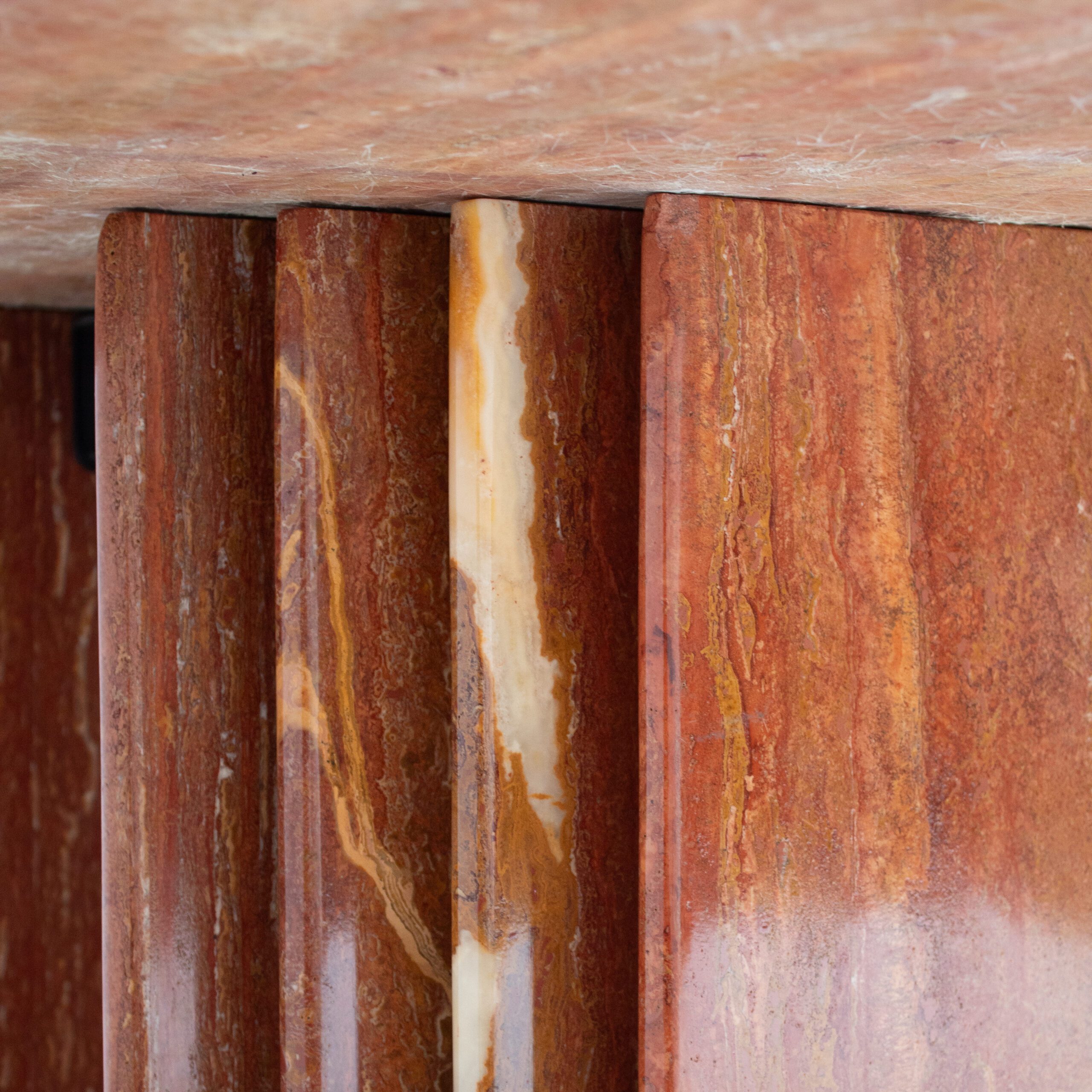 This Travertine Dining Table from the 1970s shows the essence of Italian mid-century design. The round Rosso Travertino top displays warm red tones and unique veins that shift with the light. Each glance reveals new details and makes the stone feel alive. The wide surface invites daily rituals: start the day with a quiet coffee, enjoy a family lunch, or host a long evening with friends. Vertical slabs form the sculptural base and give the table strength and character. The bold design adds weight to a room but keeps its elegance through clean, curved lines. This Travertine Dining Table does more than hold meals or objects. It sets the stage for stories, gatherings, and memories. The table blends natural beauty with a timeless look that fits both minimalist and eclectic interiors. It stands as a statement piece that combines elegance, durability, and warmth.