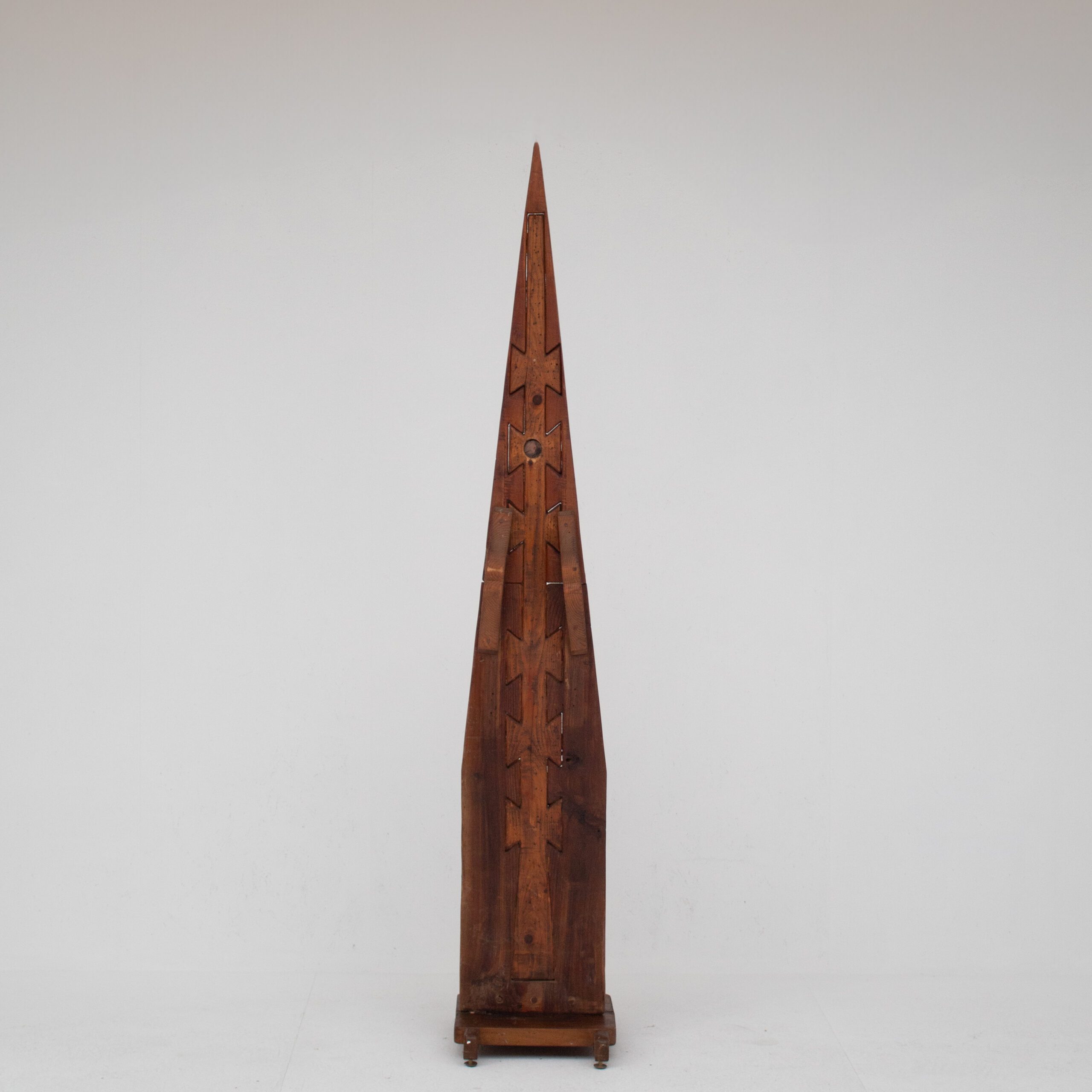 This wooden art sculpture by Luciano Bertolotto shows his talent for turning raw wood into bold, expressive forms. The tall shape rises with sharp lines and carved details that create movement and depth. Its geometric style recalls both architecture and natural symbols, giving the work a strong and timeless presence.